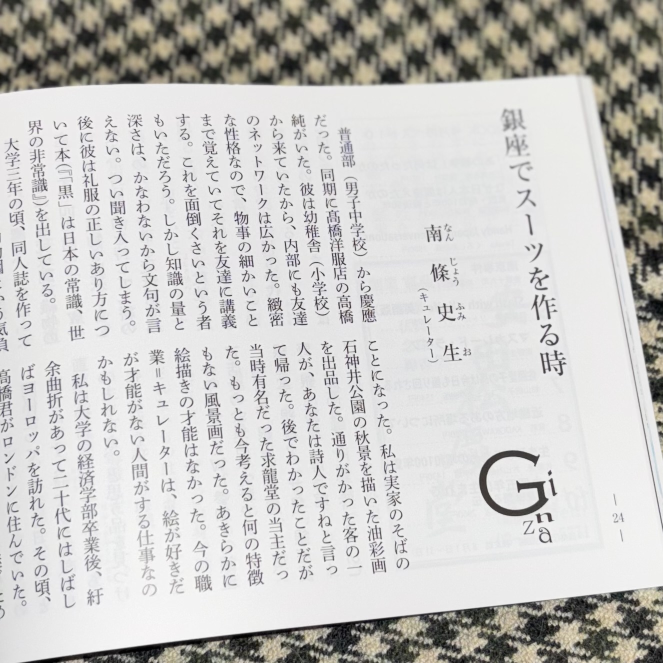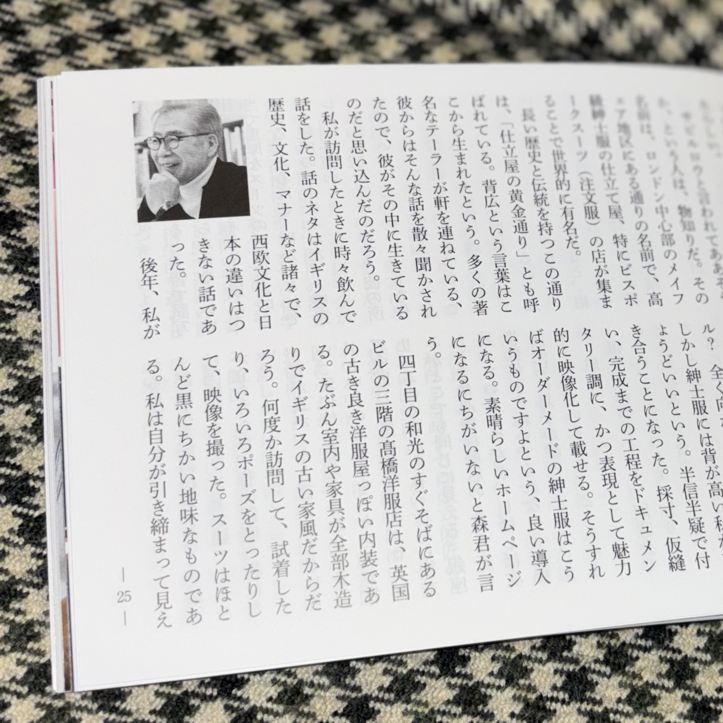 銀座百点10月号「今月のエッセイ」にてご紹介いただきました。 2025.10.02 銀座百点10月号「今月のエッセイ」にキュレーターの南條史生様が 当店および四代目の高橋純との関係について素敵な文章を寄せてくださいました。 銀座百点は当店の店頭でも配布しております。 ご興味のある方は是非ご覧くださいませ。 « 2025年10月企画 SCABAL ”SAVILE ROW CLASSICS”